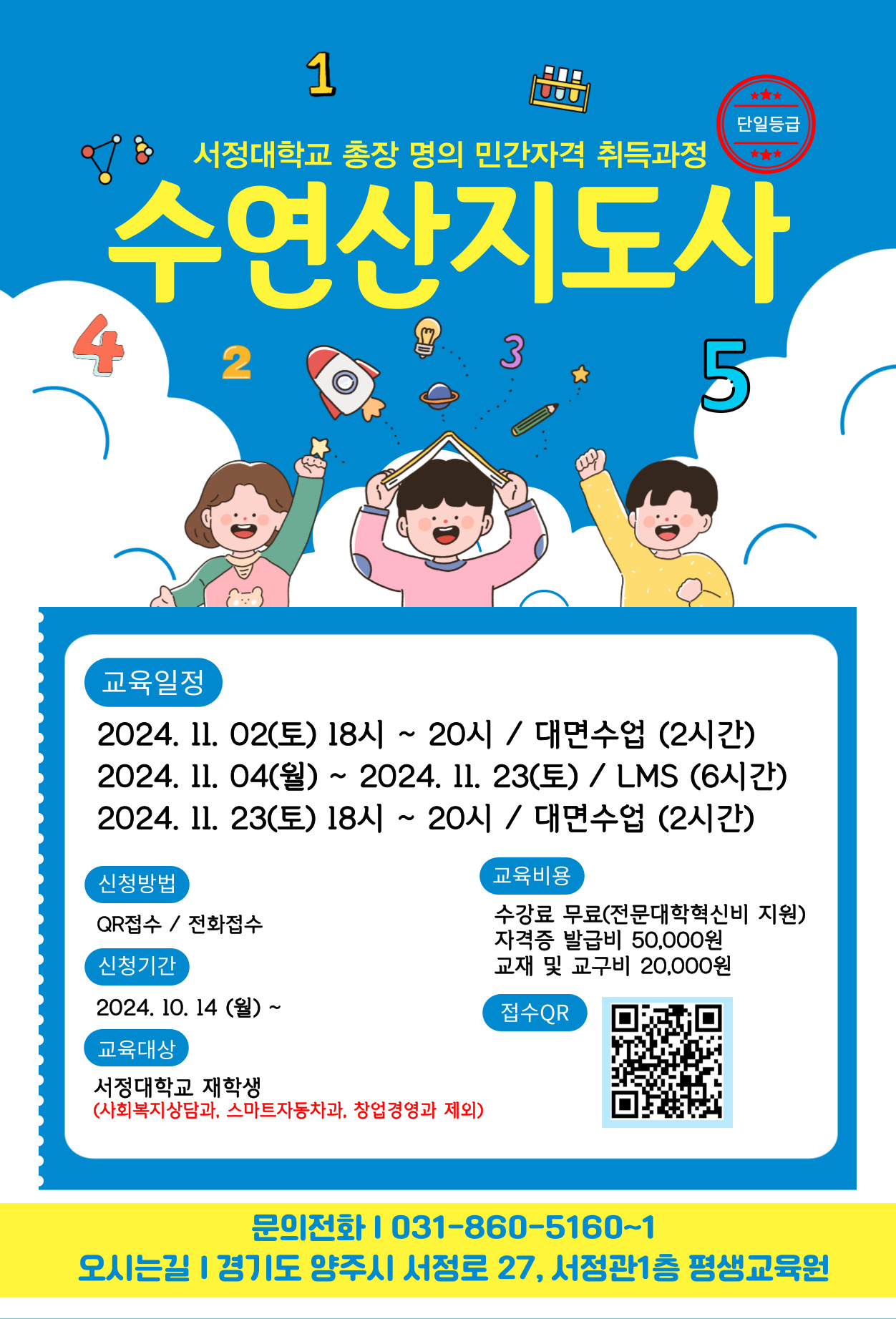 평생교육원에서는 수연산지도사 민간자격 취득과정 수강생을 모집하오니