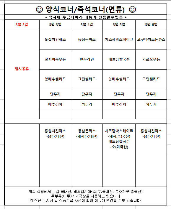 [공지] 3월1주차 학생식당 주간식단 안내입니다. N