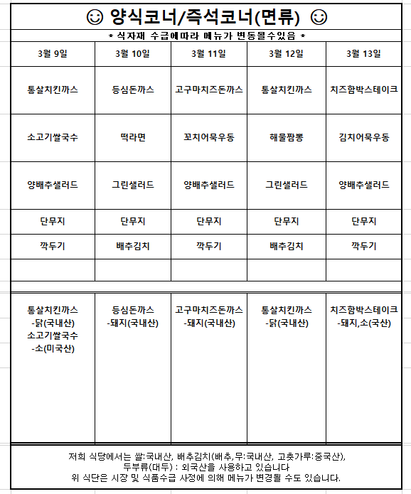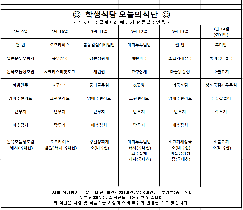 [식단표(천원의 아침밥)] 3월2주차 학생식당 주간식단 안내입니다. N