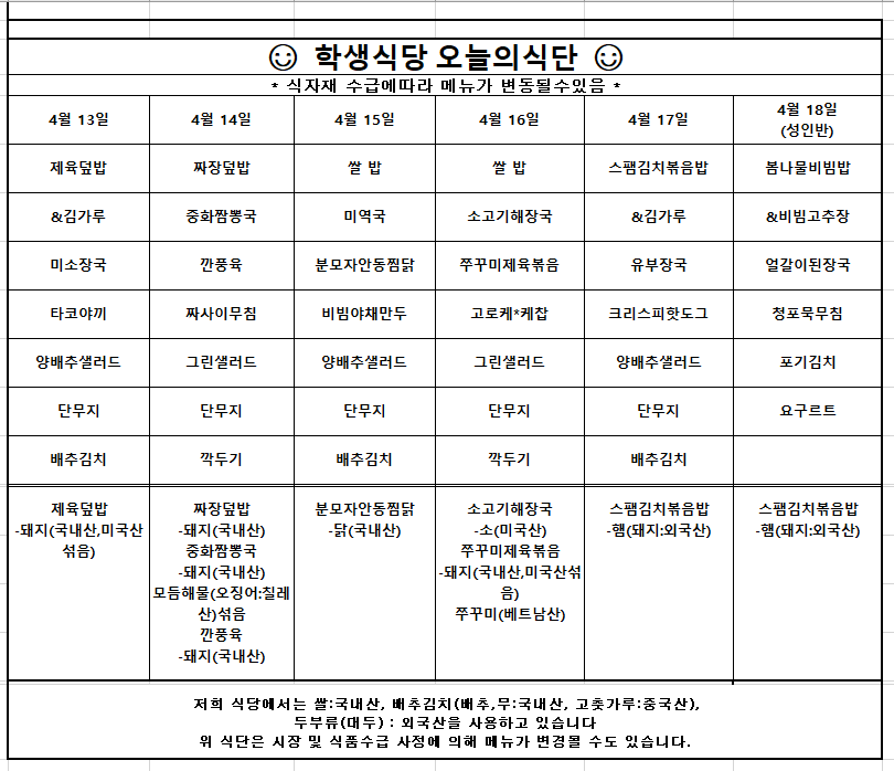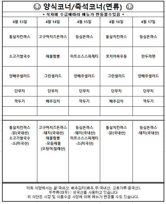 [식단표(천원의 아침밥)] 4월3주차 학생식당 주간식단 안내입니다. N