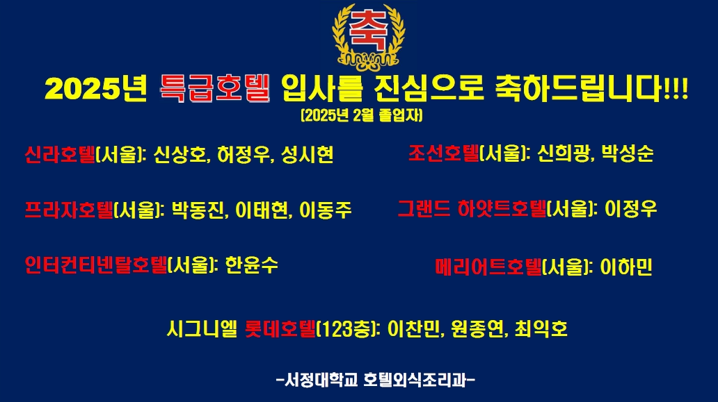 (2025년 2월 졸업자). ◆신라호텔(서울): 신상호, 허정우, 성시현 ◆시그니엘 롯데호텔(123층): 이찬민, 원종연, 최익호 ◆인터컨티넨탈호텔(서울): 한윤수 ◆조선호텔(서울): 신희광, 박성순 ◆그랜드 하얏트호텔(서울): 이정우 ◆메리어트호텔(서울): 이하민 ◆프라자호텔(서울): 박동진, 이태현, 이동주 |